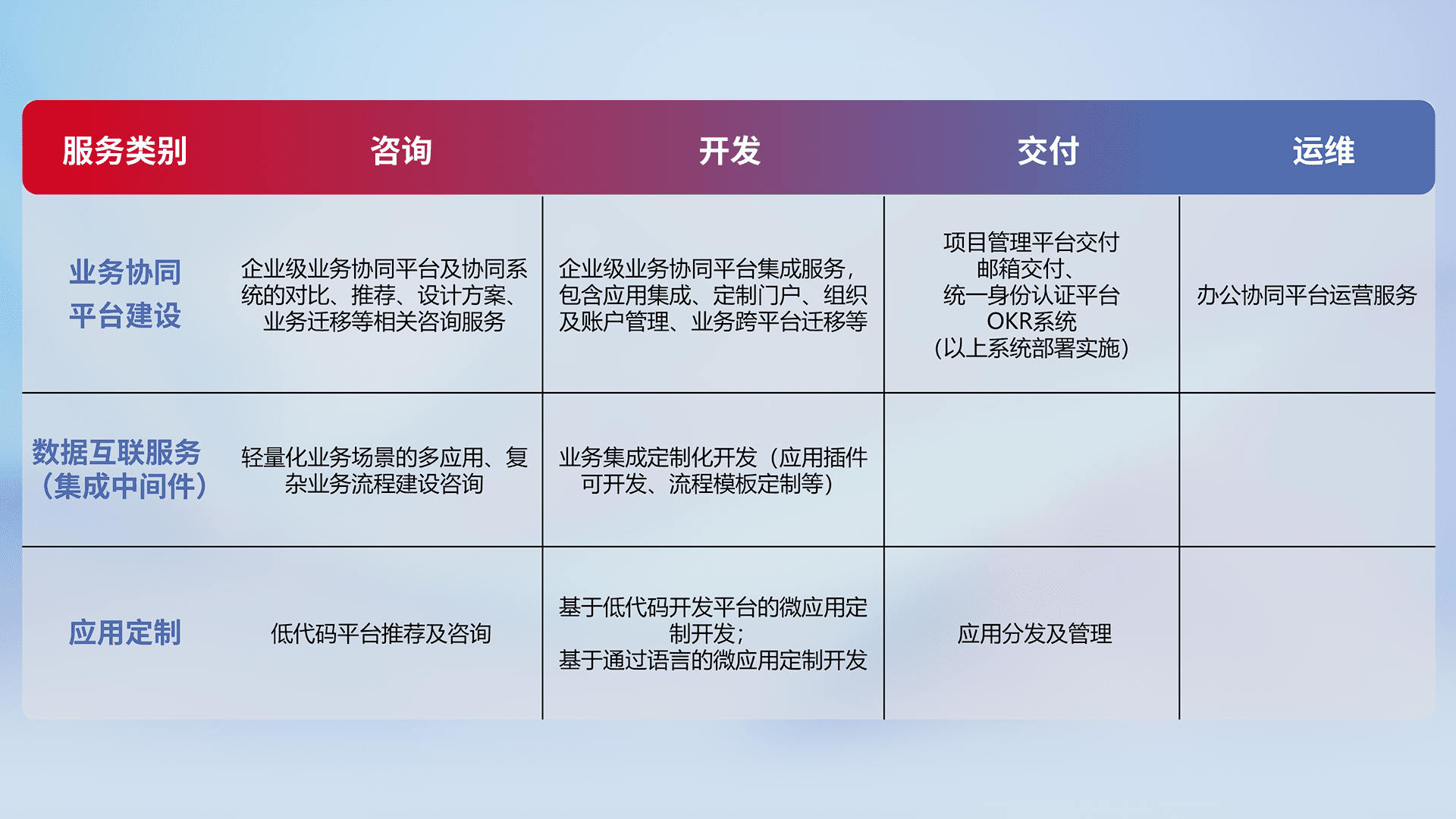 针对钉钉、、、、企微、、、、IDaas等平台级产品提供产品的规划、、、方案、、、交付、、、定制化开发等服务,,,实现如统一协同办公、、智能客户服务、、混合会议管理、、智能数据查询、、、、等业务场景,,,,实现数字化转型。。。